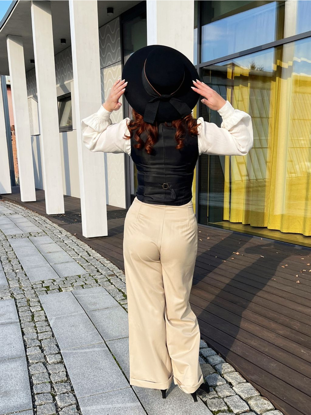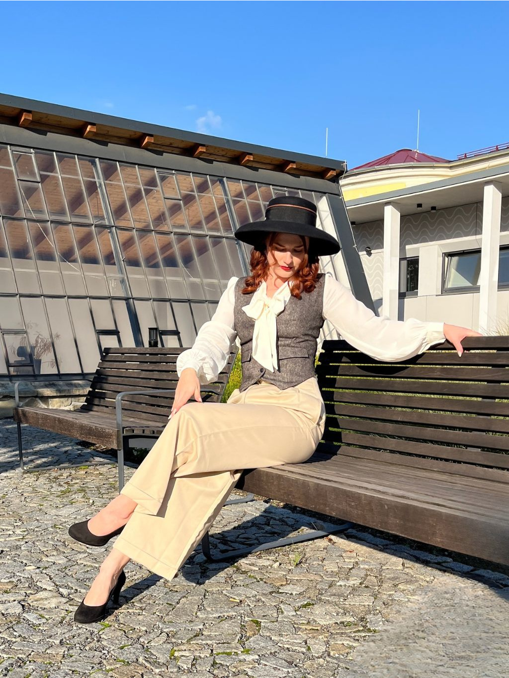 Tento model vychází z pánského stylu, který byl ikonický ve 40. letech – a právě proto dodá každému retro i elegantnímu looku špetku nadčasovosti. Přední díl je z kvalitní vlněné látky, zadní část z lehkého polyesteru. Střih krásně zvýrazní ženské křivky a doplňují jej decentní falešné klopy kapes.