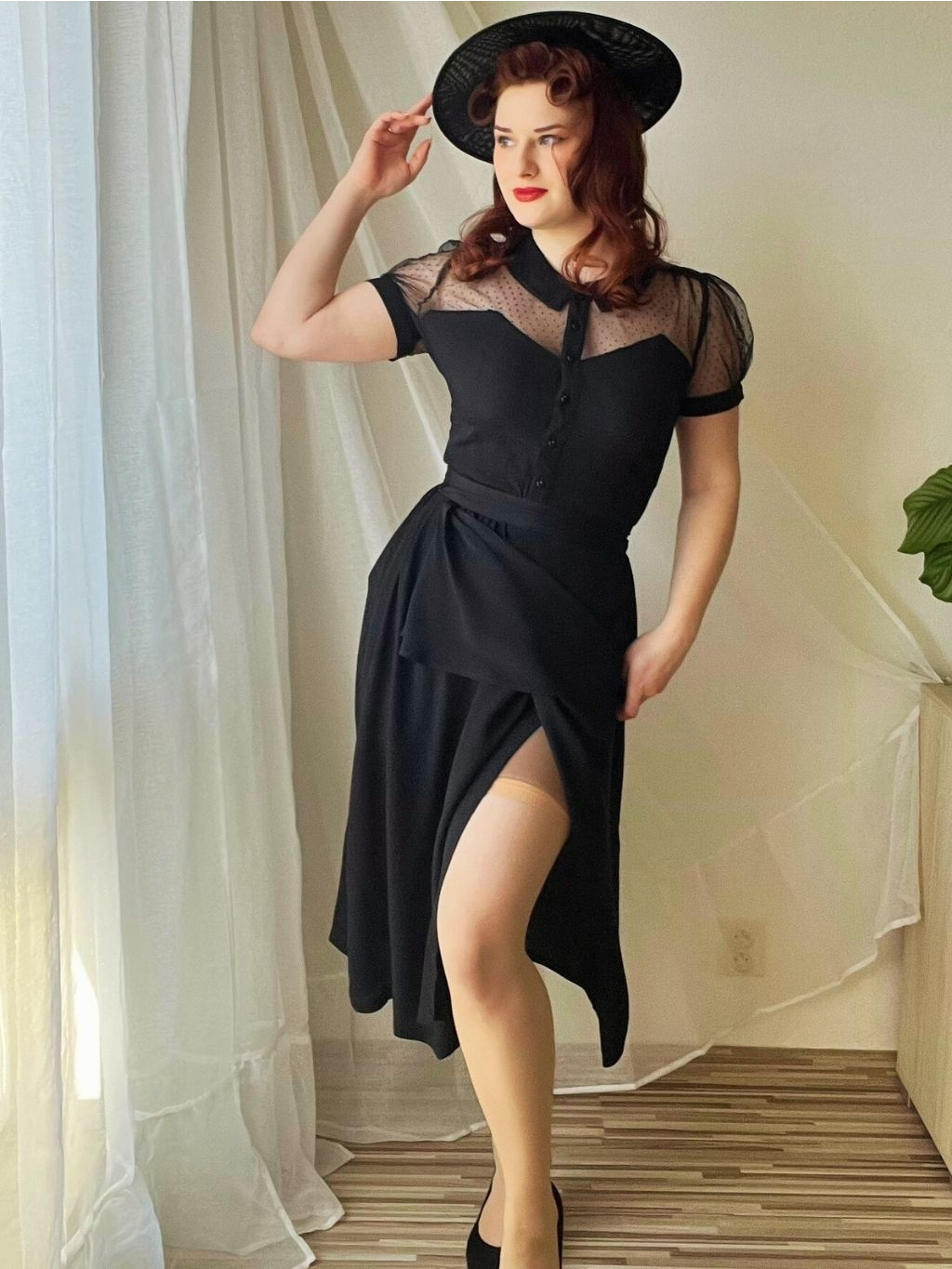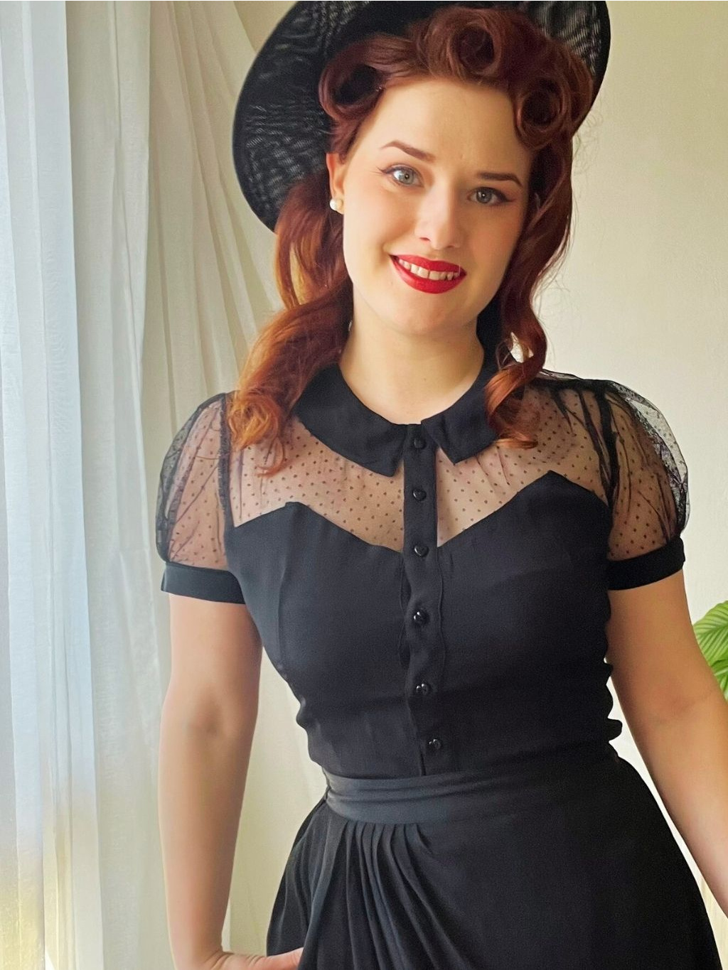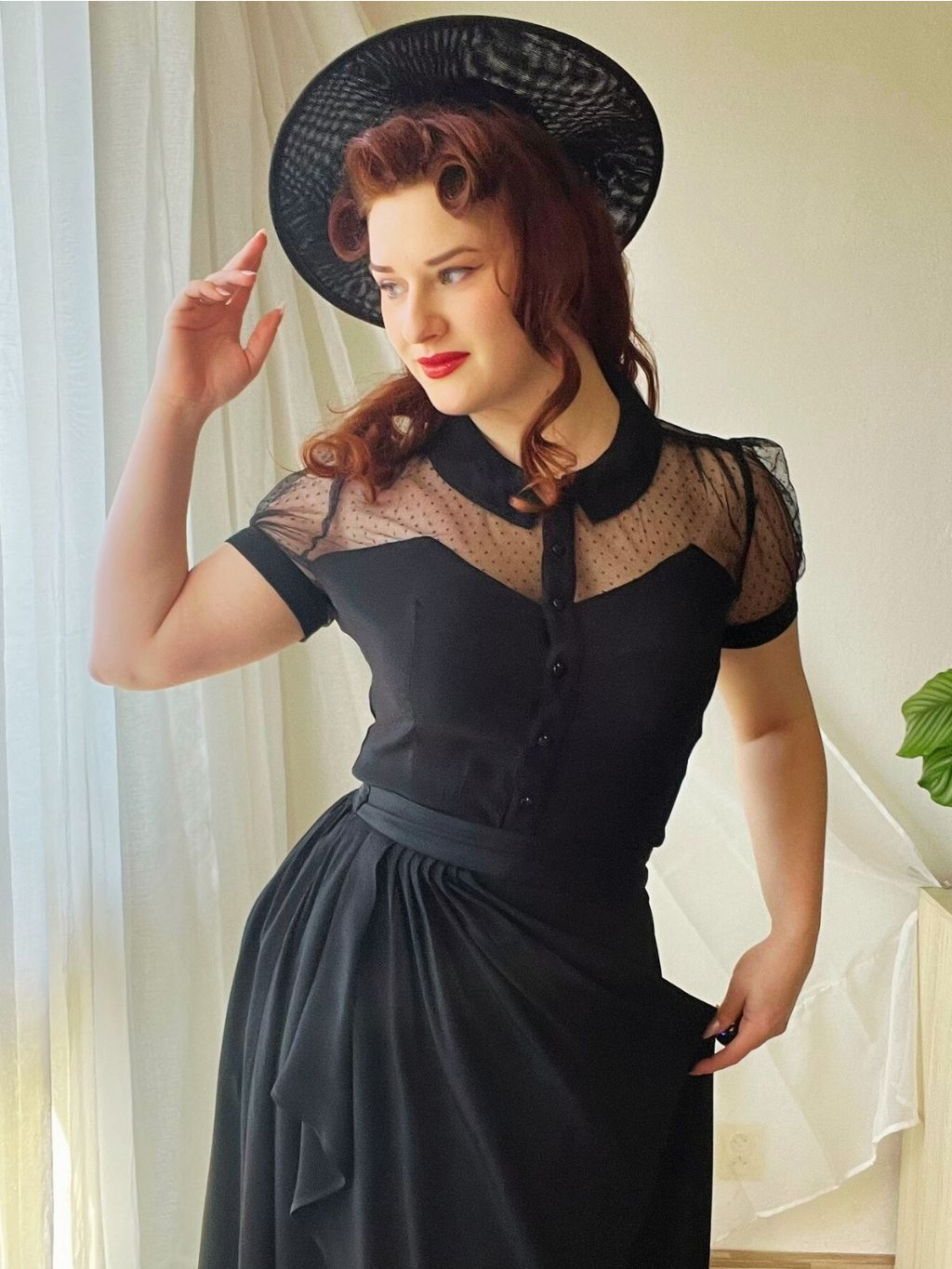 Elegantní halenka Florance v klasické černé barvě je dokonalým kouskem pro milovnice nadčasové ženskosti. Jemný průhledný tyl s drobnými puntíky, elegantní límeček a knoflíčky vytváří krásně sofistikovaný vintage vzhled, který skvěle doplní sukně i kalhoty s vysokým pasem.