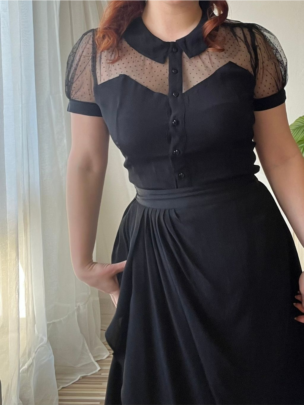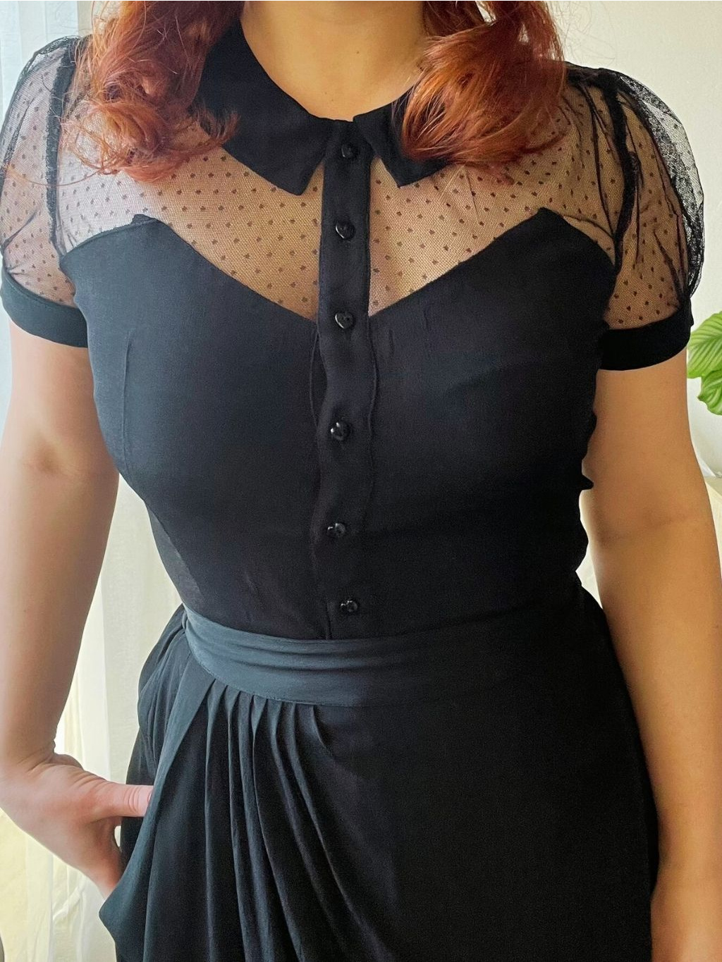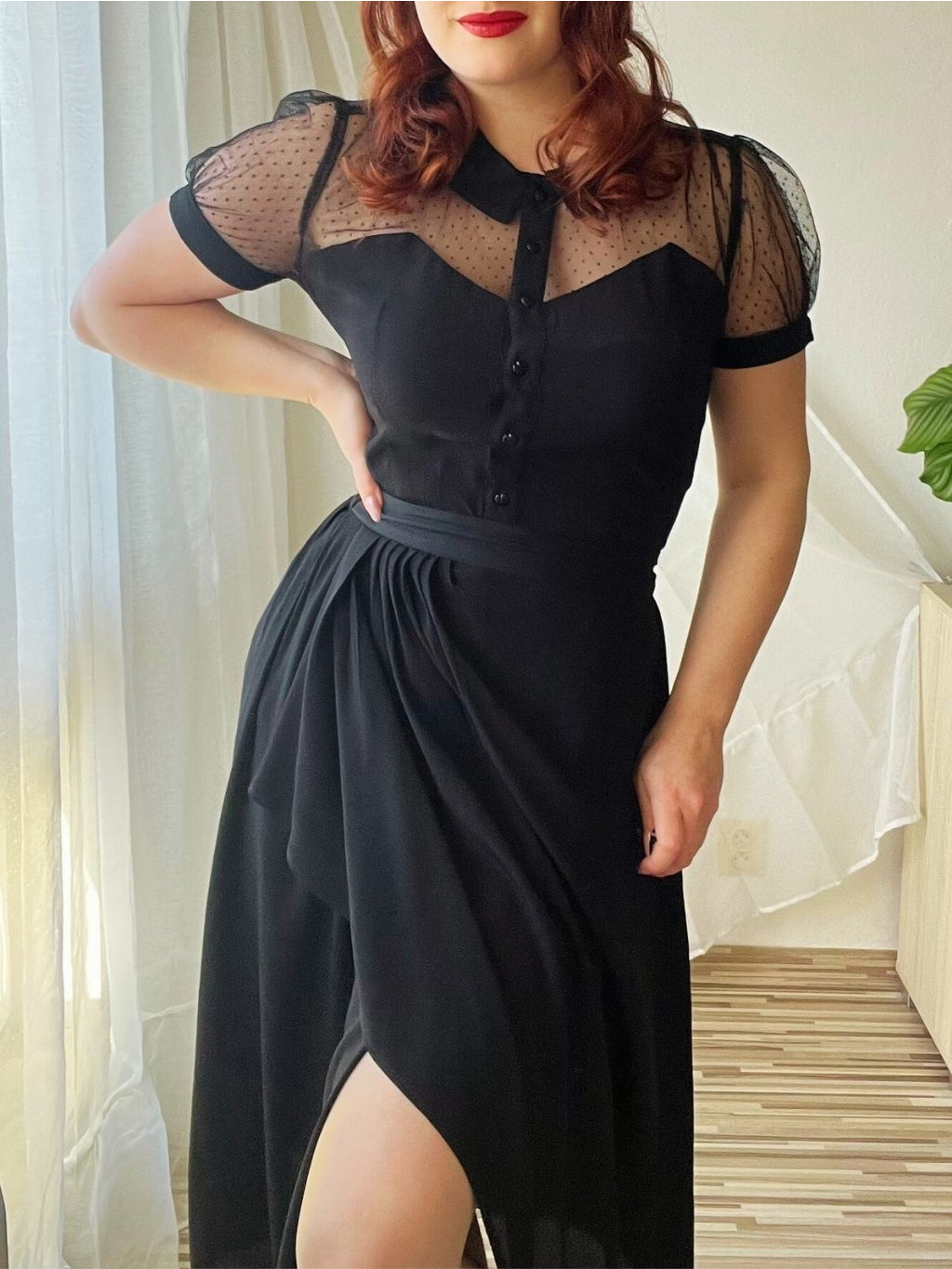 Elegantní halenka Florance v klasické černé barvě je dokonalým kouskem pro milovnice nadčasové ženskosti. Jemný průhledný tyl s drobnými puntíky, elegantní límeček a knoflíčky vytváří krásně sofistikovaný vintage vzhled, který skvěle doplní sukně i kalhoty s vysokým pasem.