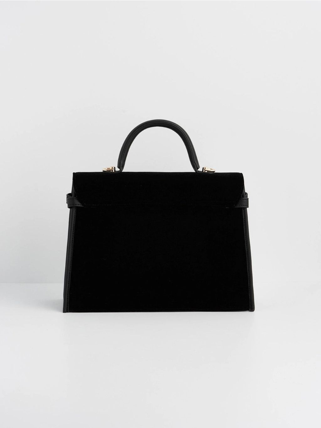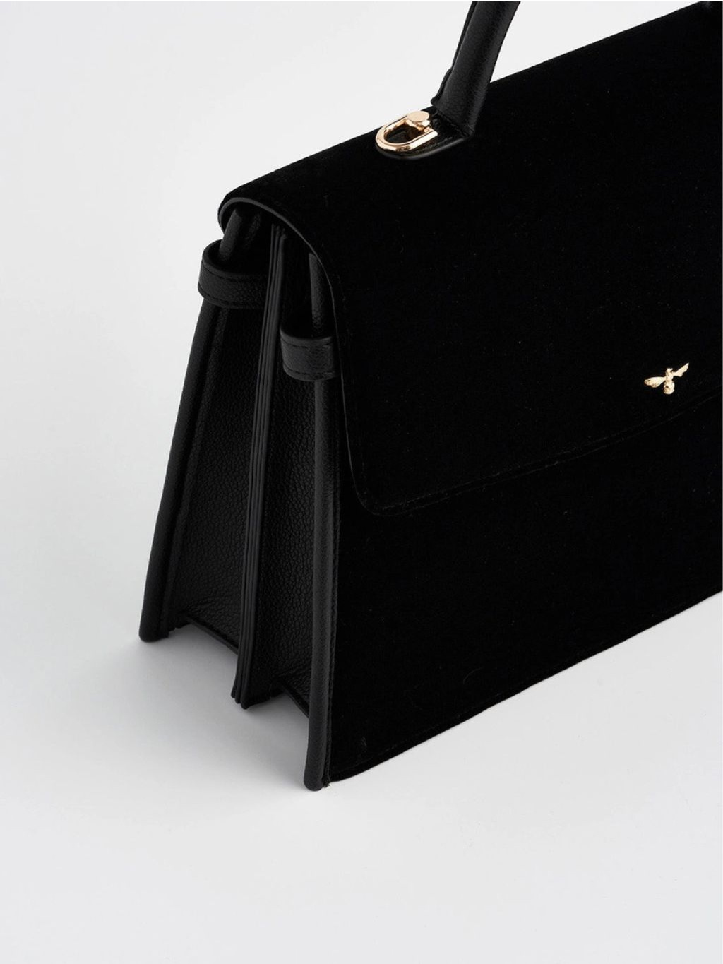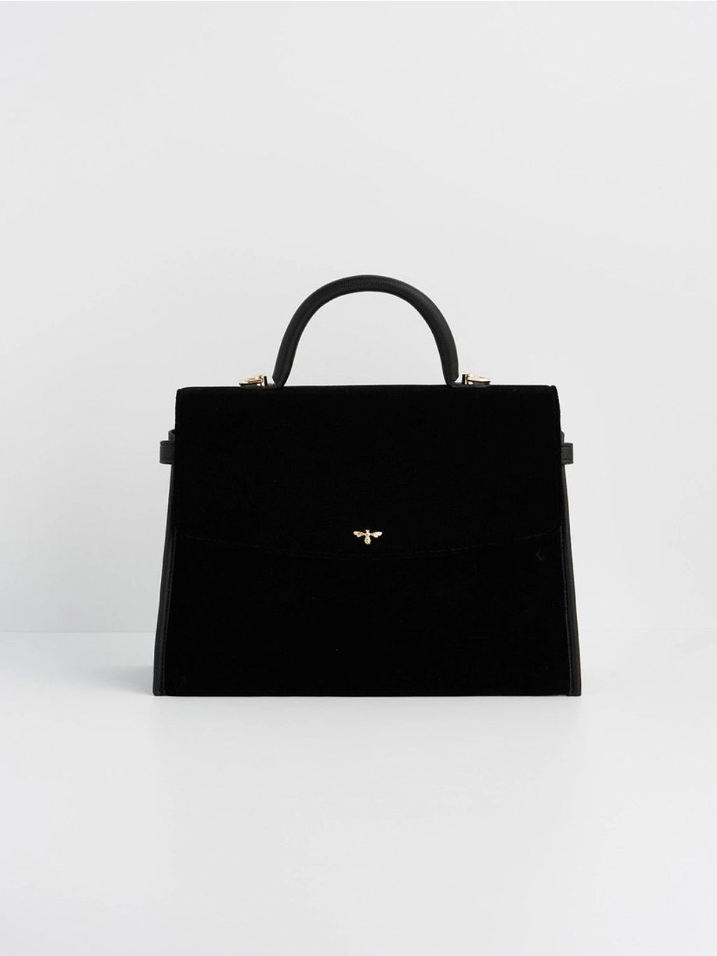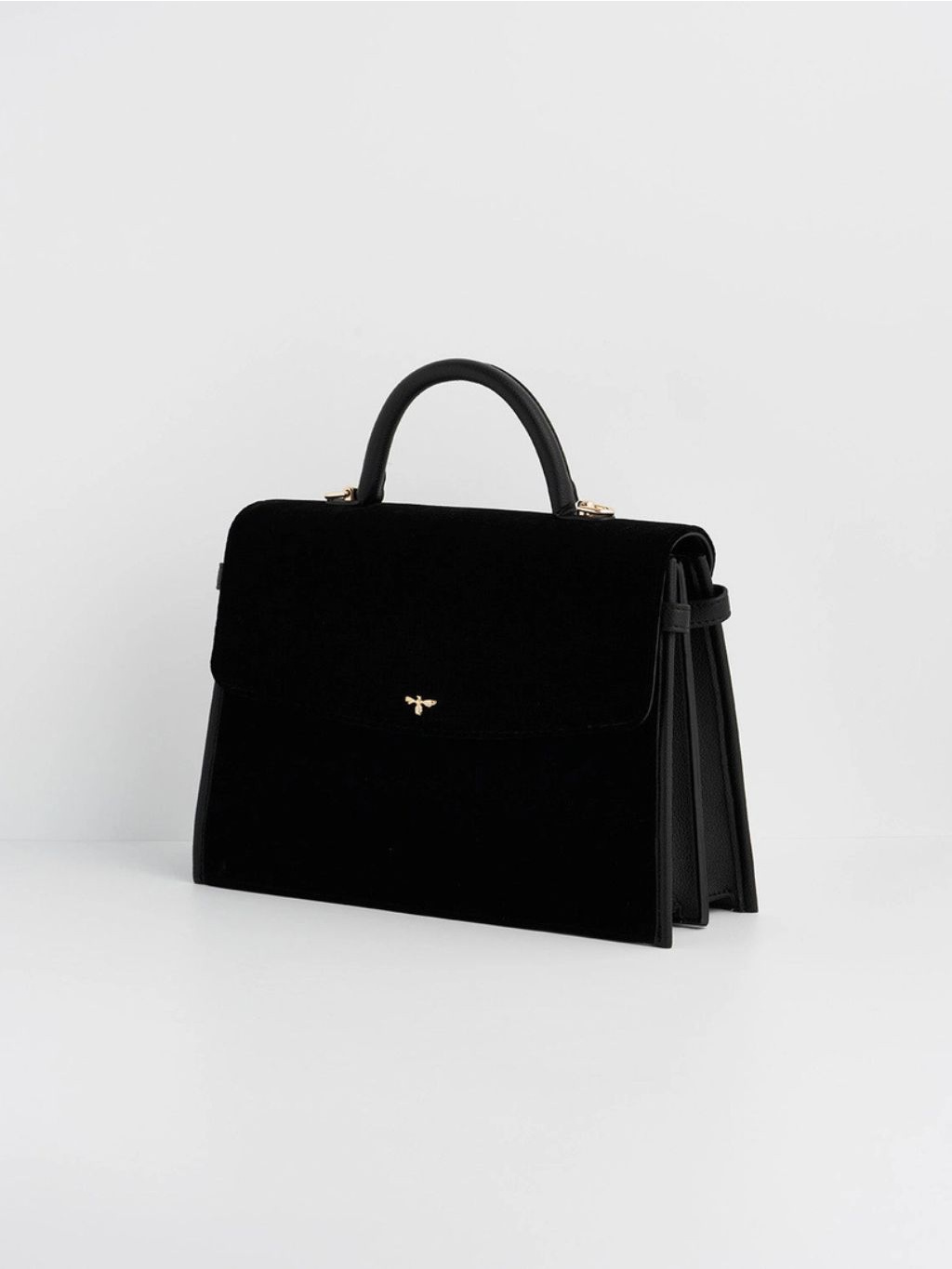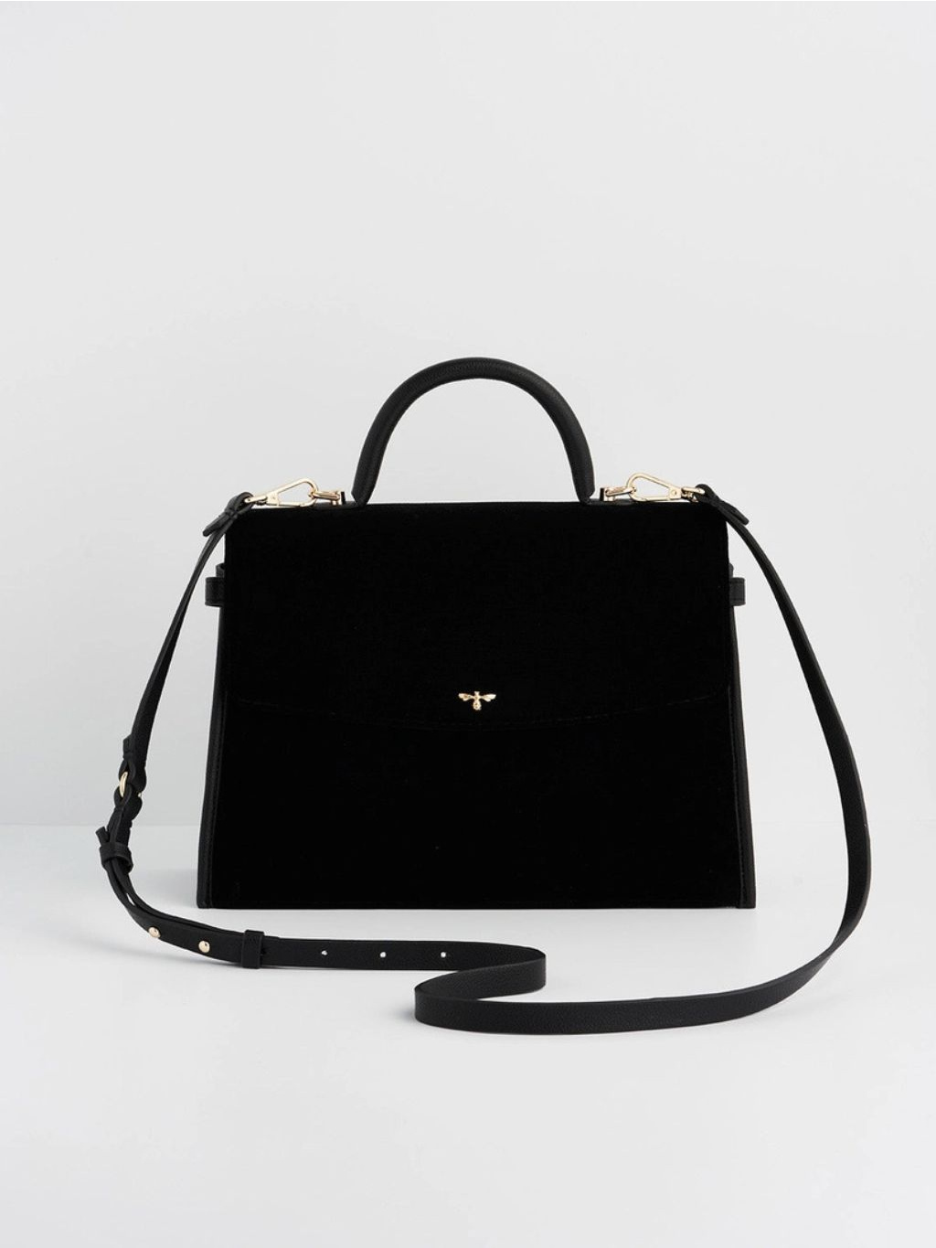 Velmi elegantní a sofistikovaná kabelka nebo chcete-li, brašna z černého sametu, Vám bude po ruce kdekoliv to bude potřeba. Ať už ji vynesete jako kufřík za ucho nebo jako crossbody kabelku pomocí odnímatelného popruhu. V hlubokém černém odstínu se zlatými detaily působí velmi elegantně.