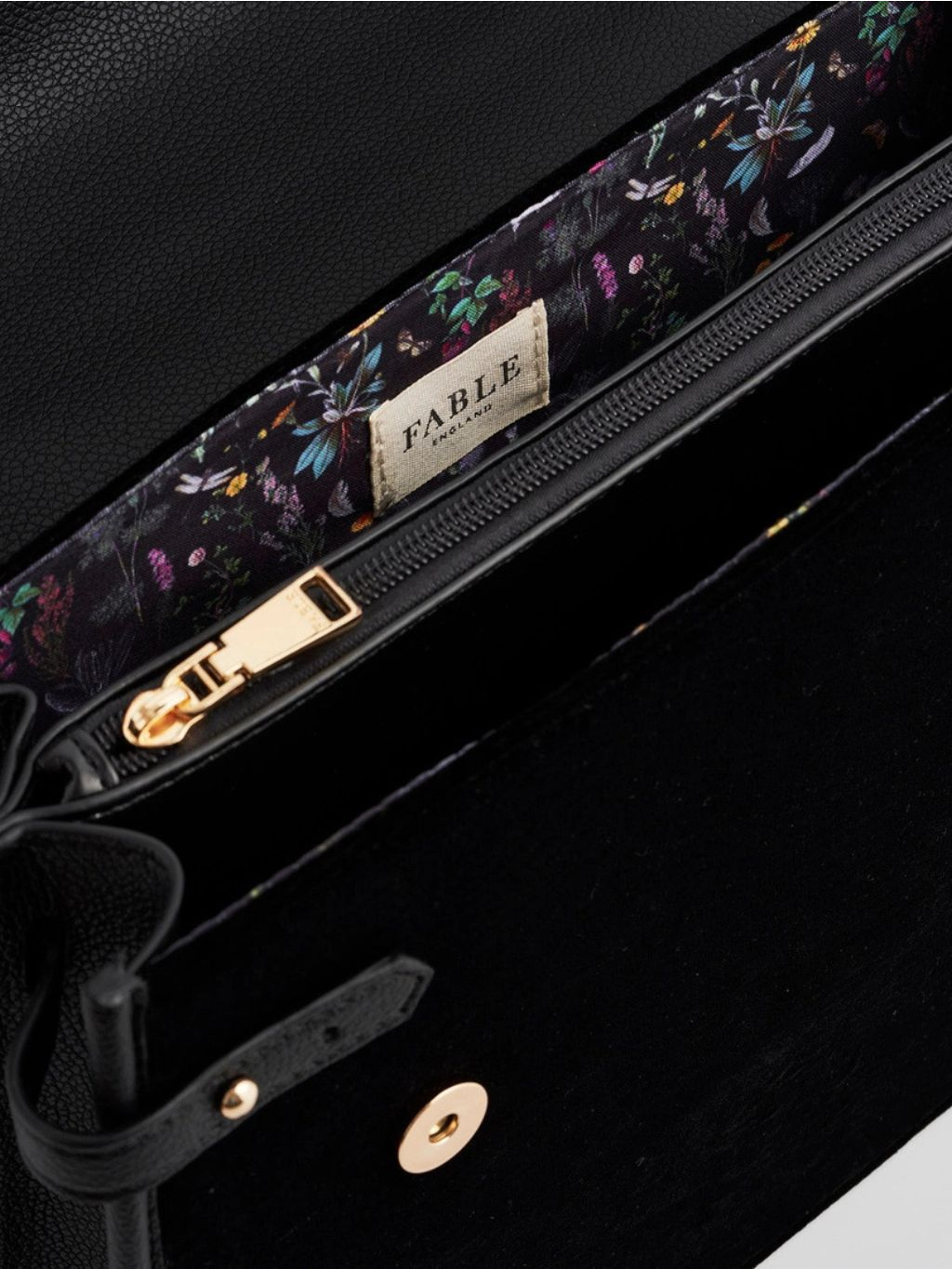 Kabelka má praktické překlápěcí zapínání na dva silné magnety. Šířku kabelky si můžete nastavit na ještě prostornější pomocí bočních popruchů se dvěma dírkami a kovových knoflíků. Kabelka má tři velké kapsy. Přední kapsa která je nejblíže magnetickému zapínání má v podšívce tři drobné kapsičky vhodné na karty či klíče. Prostřední kapsa má praktické zapínání na zip, je vhodná například na mobil nebo drobnější nezbytnosti jako jsou kapesníčky nebo rtěnka. Poslední kapsa je velikostně stejná jako ta přední, nemá žádné další kapsičky, hodí se tak například pro zápisník, tablet nebo třeba drobnou svačinu.