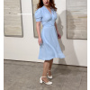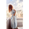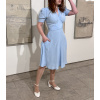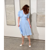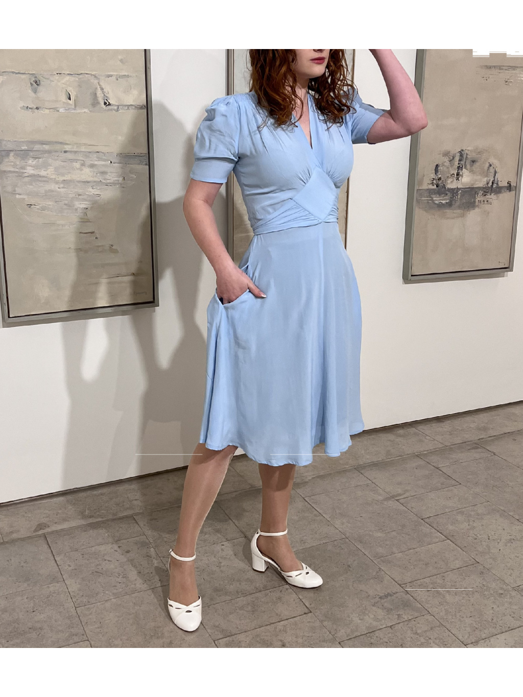 Autentyczny krój sukienki, który przeniesie Cię do lat 40. ubiegłego wieku – to właśnie model Ruby w niebiańskim odcieniu błękitu, idealny na nadchodzące wiosenne i letnie miesiące. Sukienka tworzy klasyczną sylwetkę z lat 40., z wyraźnie zaznaczonymi ramionami. Dekolt w kształcie litery V jest subtelnie marszczony przy ramionach i wokół biustu. Charakterystycznym prvkem tego modelu jest rombowy panel, do którego przyszyte są dwie wstążki – po zawiązaniu z tyłu podtrzymują linię talii přesně tam, kde ji máte přirozeně. Rozkloszowana spódnica ma praktyczne kieszenie po bokach. Sukienka ma ukryty zamek z boku. Model Ruby odkryłyśmy zupełnym przypadkiem na jednej ilustracji z lat 40. w galerii w Lizbonie – możesz więc mieć pewność, że nosisz naprawdę autentycznie uszyty model. Kolejną zaletą sukienki jest to, że materiał nie prześwituje. Na zdjęciach mam pod spodem czarną, nieprześwitującą halkę, która w ogóle nie jest widoczna. Tabelę rozmiarów znajdziesz w galerii zdjęć. Materiał: krepdeszyn będący wierną imitacją tkaniny z epoki, wykonany w 100% z naturalnych włókien. Materiał nie prześwituje. Producent zaleca pielęgnację w duchu lat 40., aby wydłużyć trwałość ubrania. Jak dokładnie o nie dbać, przeczytasz w artykule na moim blogu.