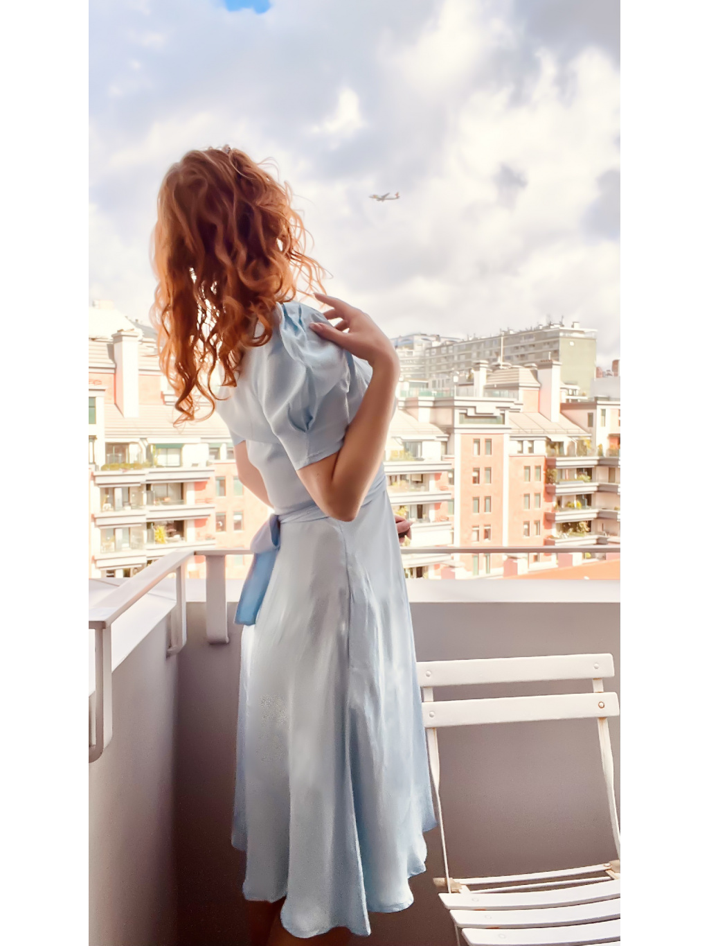 Autentyczny krój sukienki, który przeniesie Cię do lat 40. ubiegłego wieku – to właśnie model Ruby w niebiańskim odcieniu błękitu, idealny na nadchodzące wiosenne i letnie miesiące. Sukienka tworzy klasyczną sylwetkę z lat 40., z wyraźnie zaznaczonymi ramionami. Dekolt w kształcie litery V jest subtelnie marszczony przy ramionach i wokół biustu. Charakterystycznym prvkem tego modelu jest rombowy panel, do którego przyszyte są dwie wstążki – po zawiązaniu z tyłu podtrzymują linię talii přesně tam, kde ji máte přirozeně. Rozkloszowana spódnica ma praktyczne kieszenie po bokach. Sukienka ma ukryty zamek z boku. Model Ruby odkryłyśmy zupełnym przypadkiem na jednej ilustracji z lat 40. w galerii w Lizbonie – możesz więc mieć pewność, że nosisz naprawdę autentycznie uszyty model. Kolejną zaletą sukienki jest to, że materiał nie prześwituje. Na zdjęciach mam pod spodem czarną, nieprześwitującą halkę, która w ogóle nie jest widoczna. Tabelę rozmiarów znajdziesz w galerii zdjęć. Materiał: krepdeszyn będący wierną imitacją tkaniny z epoki, wykonany w 100% z naturalnych włókien. Materiał nie prześwituje. Producent zaleca pielęgnację w duchu lat 40., aby wydłużyć trwałość ubrania. Jak dokładnie o nie dbać, przeczytasz w artykule na moim blogu.