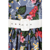 Sukienka ma z przodu interesujące podwójne ramiączka w białym kolorze, które z tyłu łączą się w jedno. Ramiączka mają regulowaną długość, dzięki czemu można je dopasować do siebie. Gorset w kształcie serca jest uzupełniony kontrastowym białym paskiem, który jest częścią sukienki. Spódnica sukienki jest marszczona i wystarczająco szeroka, aby pomieścić halkę lub obszerną spódnicę. W skład spódnicy wchodzą również dyskretnie wszyte kieszenie, które doceni każda praktyczna kobieta. Sukienka zapinana jest na ukryty zamek z tyłu.