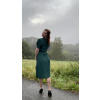 Czarująca sukienka jak wyjęta z srebrzystej tkaniny lat 40. XX wieku. Krój jest jednak niesamowicie korzystny i noszalny również dziś. Dekolt w kształcie serca jest uzupełniony delikatnym marszczeniem po bokach, na ramionach znajdują się cienkie poduszki (łatwe do odpięcia) dla prawdziwego vintage looku. Rękawy są typowo bufiaste. Zapięcie sukienki stanowi guzik przy szyi oraz dekolt w kształcie kropli, do którego dopinany jest ukryty zamek błyskawiczny. Krój sukienki jest dopasowany szerokim pasem materiału, który tworzy sylwetkę klepsydry. Na stałe przyszyta kopertowa spódnica z doskonale eleganckim marszczeniem ukryje również większy brzuszek i idealnie dopasuje się do każdego typu figury. W spódnicy wszyte są również ukryte kieszenie, które czynią ten model nie tylko eleganckim, ale i praktycznym.