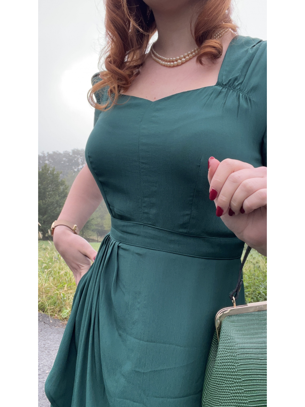 Materiał krepdeżyn, z którego wykonany jest ten element, to wierna imitacja tkaniny z epoki i jest w 100% z naturalnych włókien. Nie musisz obawiać się, że materiał będzie prześwitywał. Producent zaleca pielęgnację tego ubrania tak, jak w latach 40., aby przedłużyć jego trwałość. Jak to zrobić, przeczytasz w tym artykule na moim blogu.