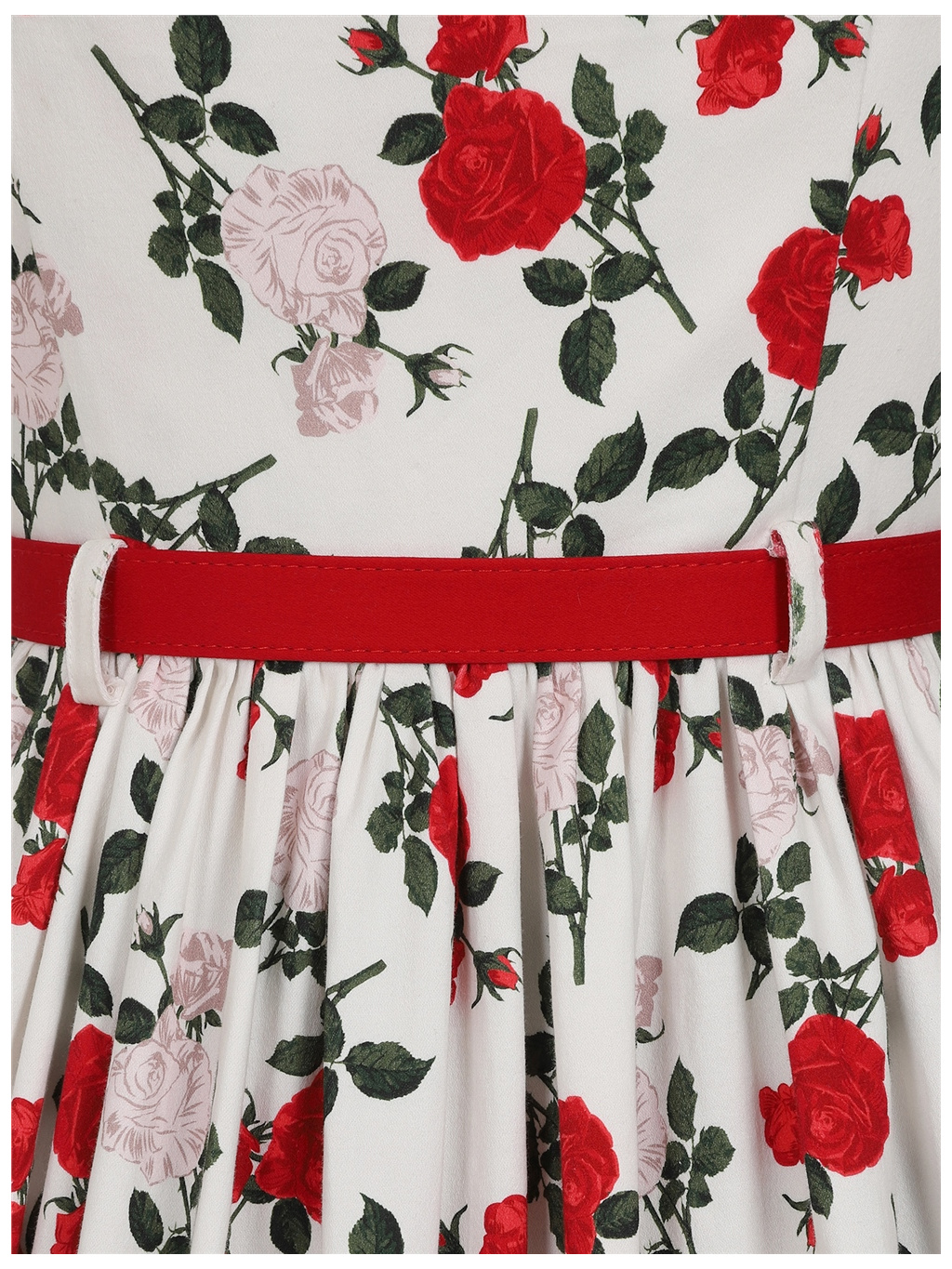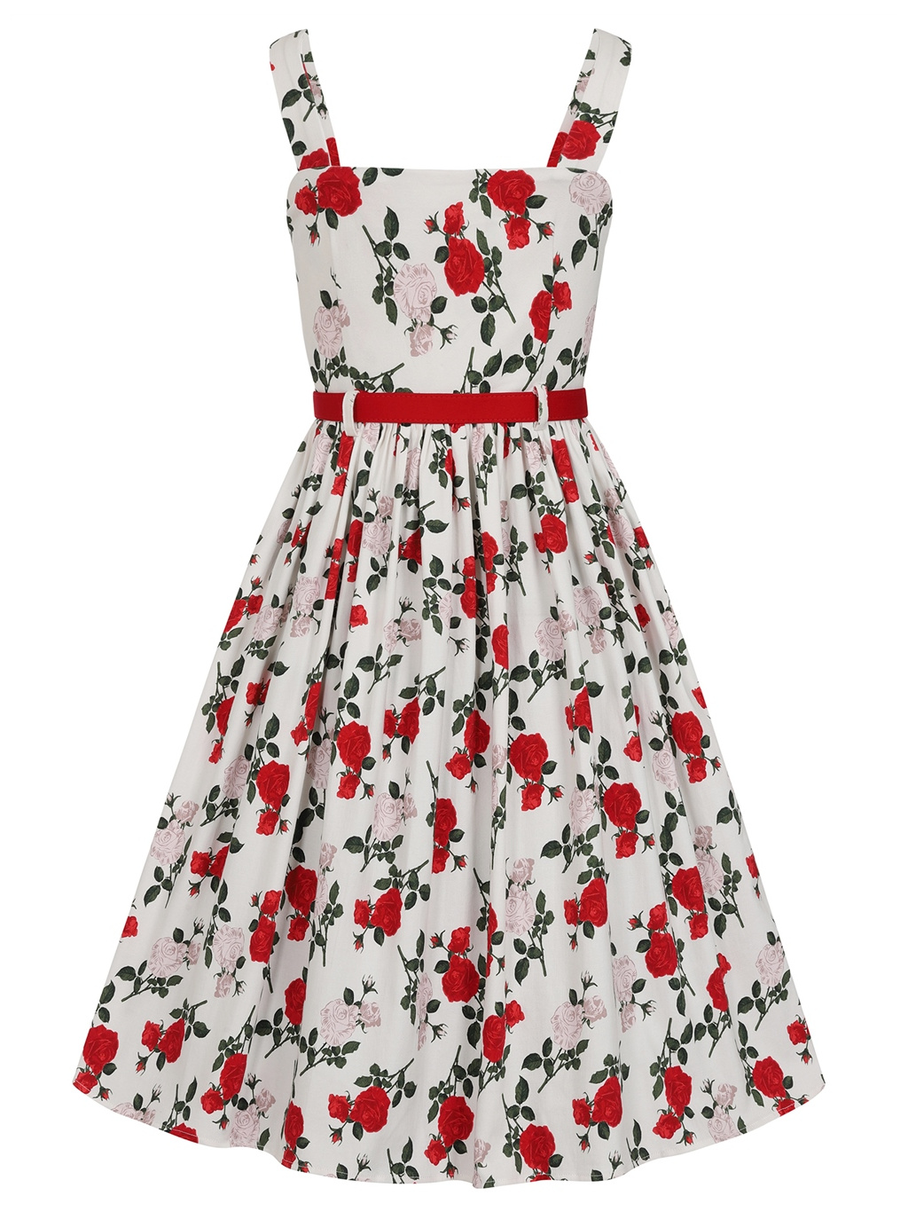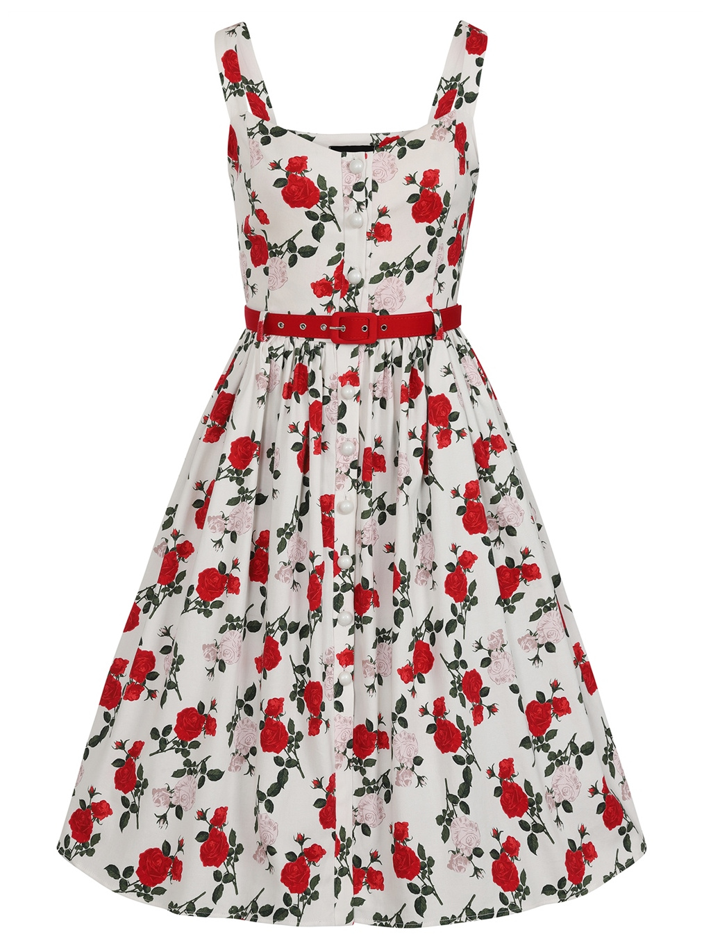 Šaty jako ze snu (jako pro pravou Stepfordskou paničku).Šaty Jemima ideální pro jarní a letní měsíce dozajista okouzlí nejen Vás, ale iVaše okolí. Široká ramínka zajistí pohodlí při nošení. Šaty jsou celopropínací, což ocení třeba i kojící maminky. Široká řasená sukně má v bocíchvšité skryté kapsy. Potisk bílých a rudých růží byl originálně navrhnut přesněpro tyto šaty. Součástí je také pevný pásek v červené barvě, kterýzvýrazní Váš pas. Sukně sahá pod kolena, celková délka šatů je přibližně 107cm. Doporučujeme zakoupit k šatům také objemovou spodničku Hollywood,kterou taktéž naleznete v naší nabídce.