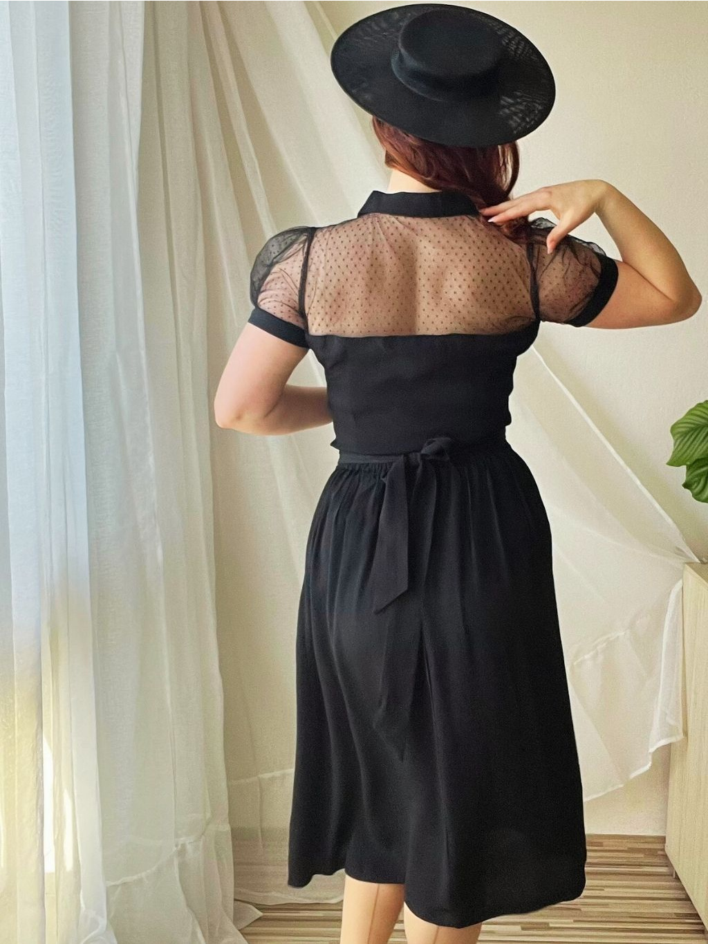Materiál krepdešín, ze kterého je tento kousek vyroben je přesnou imitací dobové látky a je ze 100 % přírodních vláken. Nemusíte se také bát,že by látka prosvítala. Výrobce doporučuje pečovat o tento oděv stejně jako ve 40. letech, abyste tak prodloužili jeho životnost.