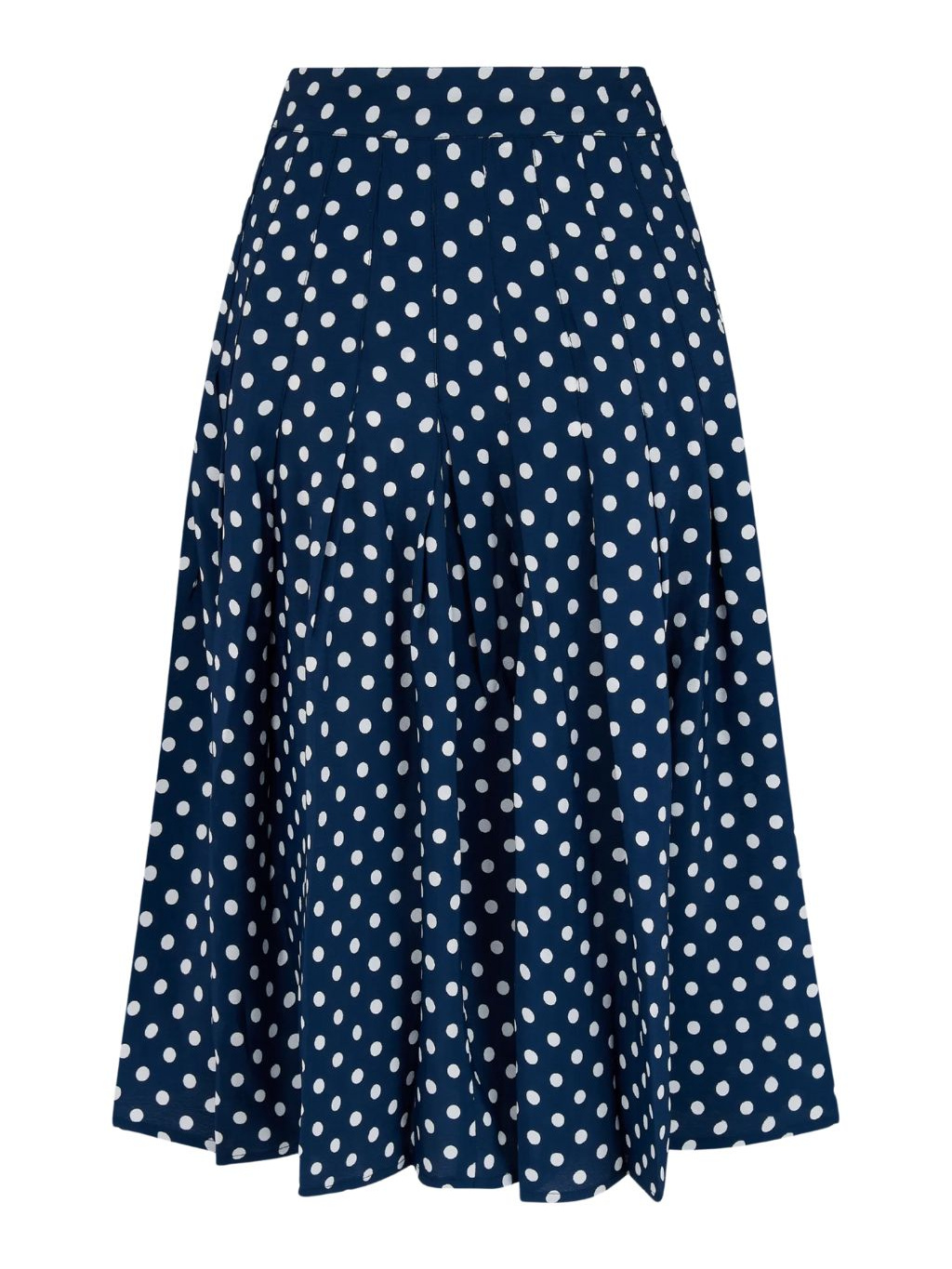 Kolová sukně s nestárnoucím vzorem krémových puntíků na námořnicky modrém podkladu. Doplňte ji krémovou halenkou a získáte nadčasový outfit vhodný do kanceláře, ale klidně i do retro tančírny. Sklady se rozšiřují od boků, což dodává sukni autentický vzhled 40. let. V boku se nachází skryté zapínání doplněné funkčním bakelitovým knoflíkem v modré barvě. Pro dokonalý efekt doporučuji přikoupit spodničku 1940 z mé nabídky.