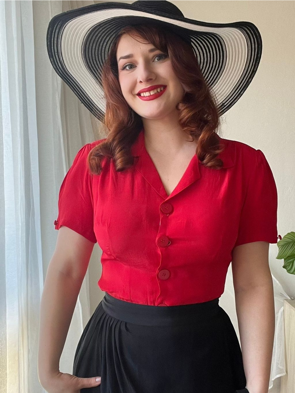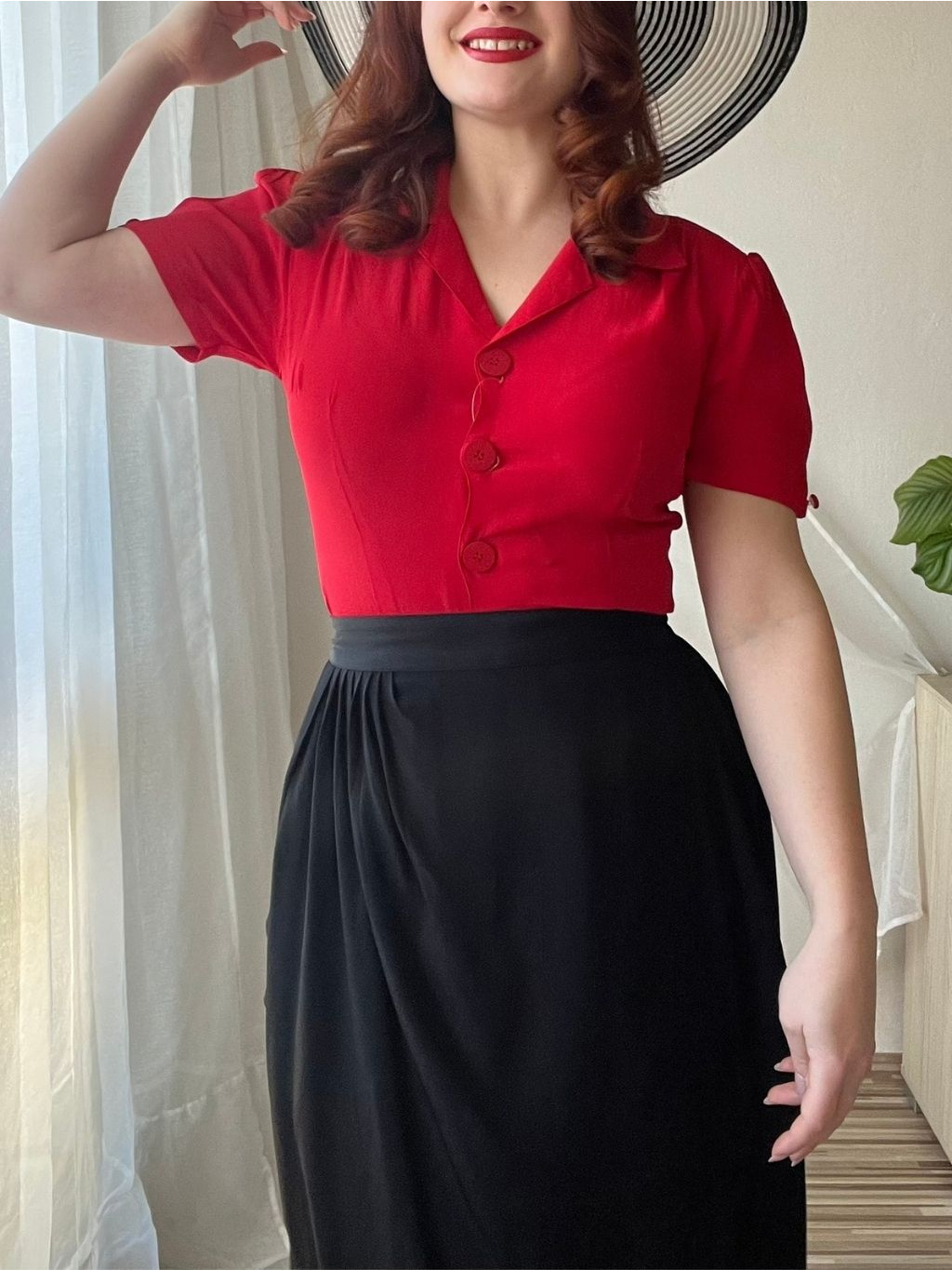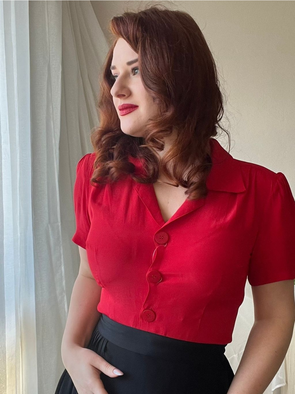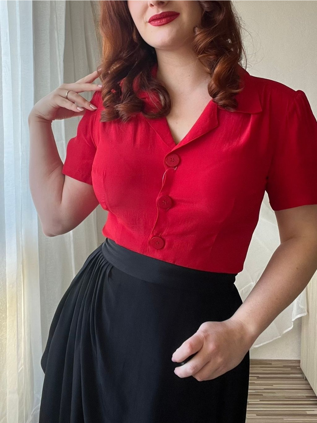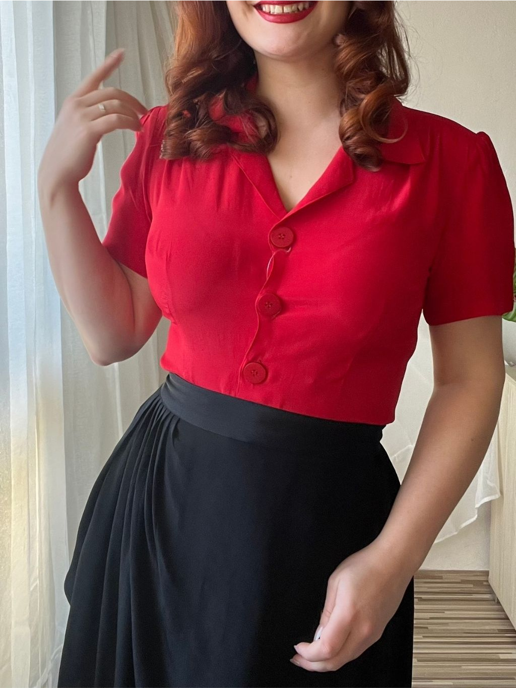 Klasická košilová halenka s krátkým rukávem v syté rtěnkově červené barvě. Výrazný a “ostře” střižený límec halence dodává ten pravý retro nádech, stejně jako nadýchané krátké rukávy s řasením zakončeným knoflíčkem. U ramenou a na zádech má halenka jemné řasení. Projmutý ženský střih zajistí, že halenka hezky přilehne k tělu a nebude zbytečně někde plandat nebo se kasat ze sukně. Propínání je vyšperkováno velkými bakelitovými knoflíky. Jedná se o další nadčasový kousek z dílny The Seamstress of Bloomsbury.