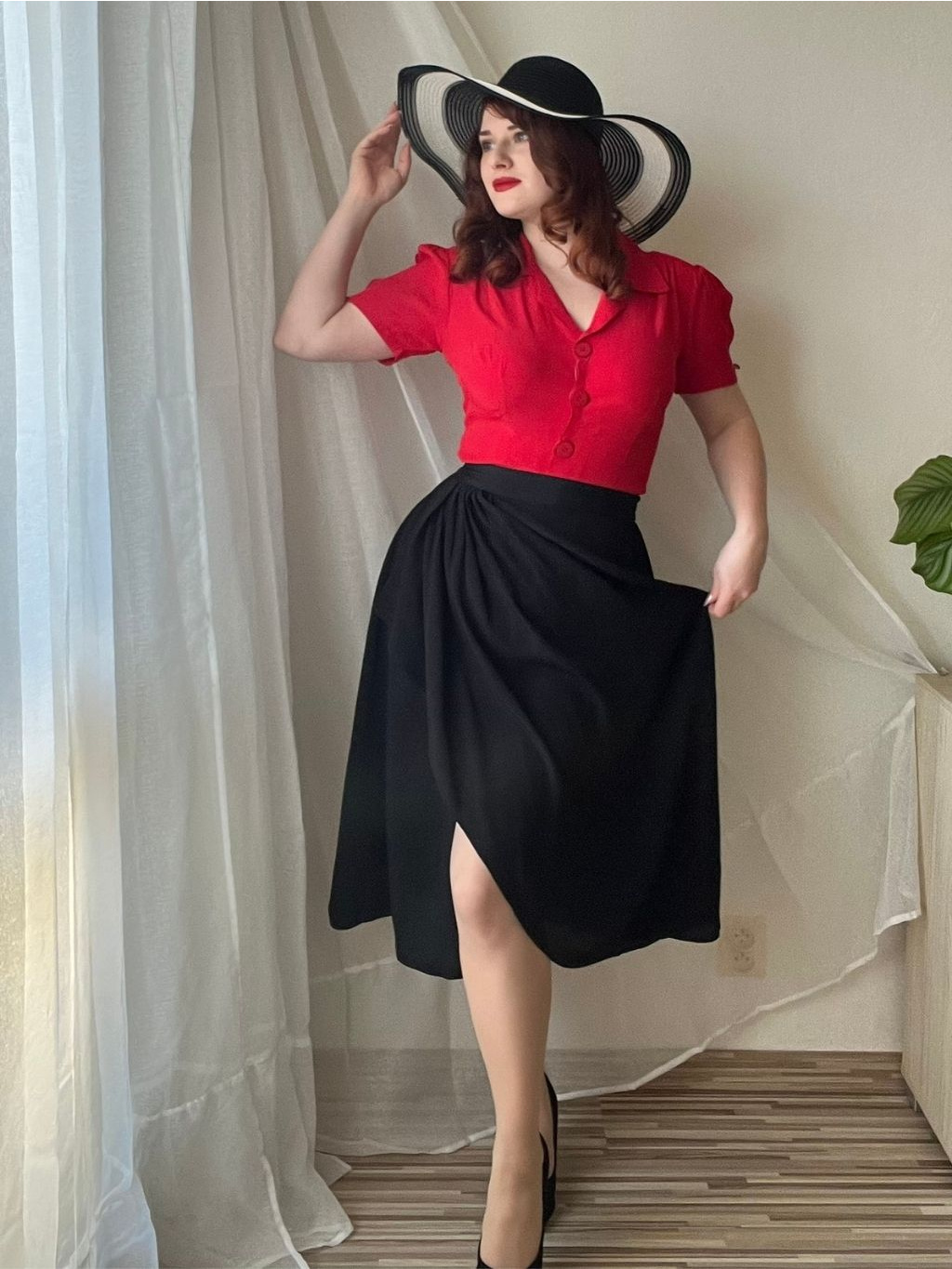 Halenka klasického a elegantního retro střihu ve svůdně rudém odstínu, který osvěží Váš outfit. Slaďte ji se sukní Isabelle či Sylvia nebo ji vyneste ke kalhotám Audrey, vedle rozhodně nesáhnete. Pro detailnější popis si přečtěte podrobnější popisek níže.