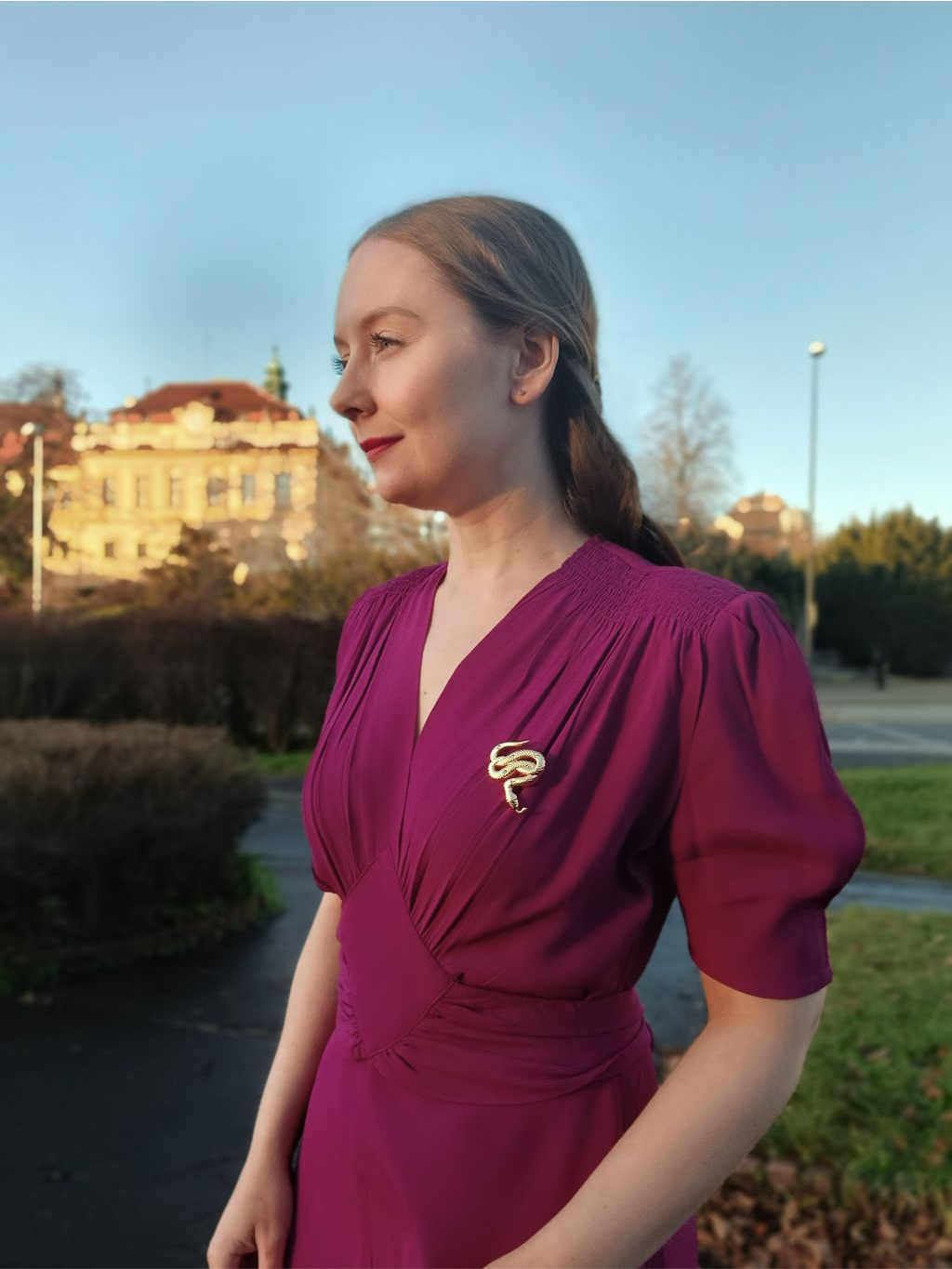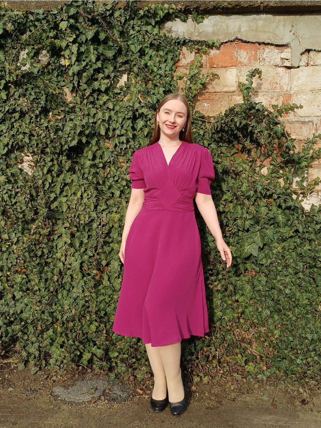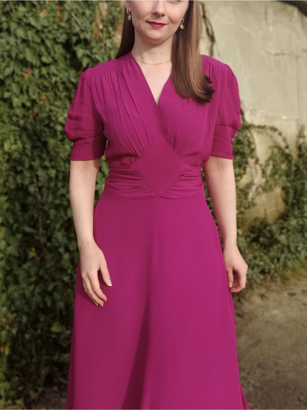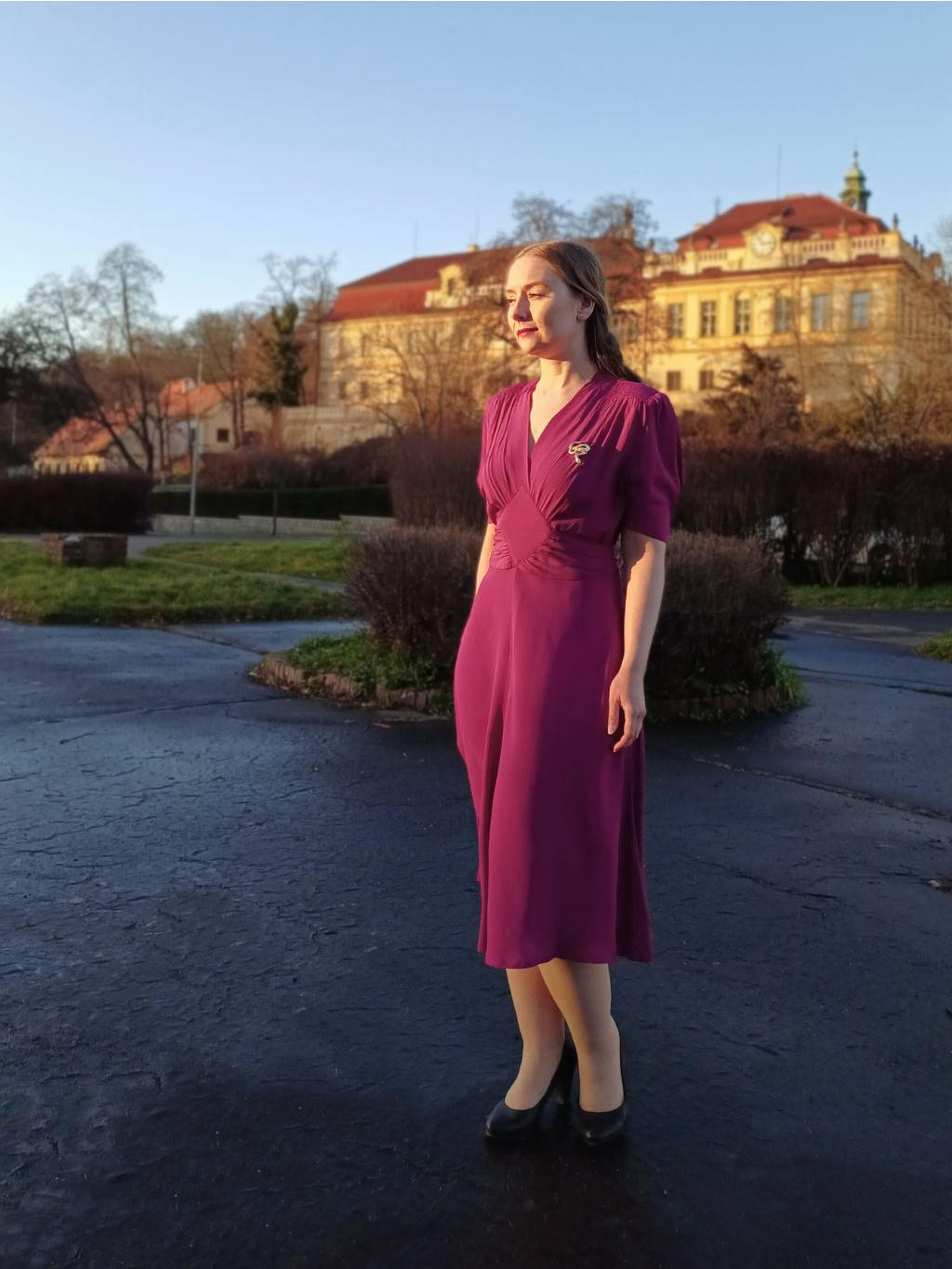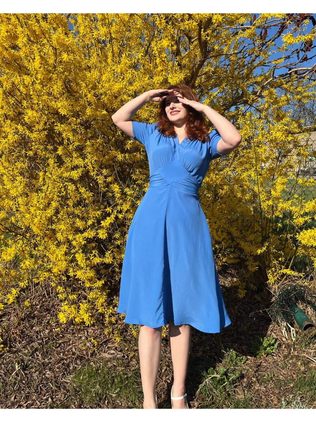 Šaty jsme úplnou náhodou našli také na jedné kresbě ze 40. let v galerii v Lisabonu, můžete si tak být jistá, že nosíte opravdu autenticky ušitý kousek. Jejich výhodou také je, že látka neprosvítá. Na fotografiích mám pod šaty černou neprůsvitnou spodničku a nejde vůbec vidět.