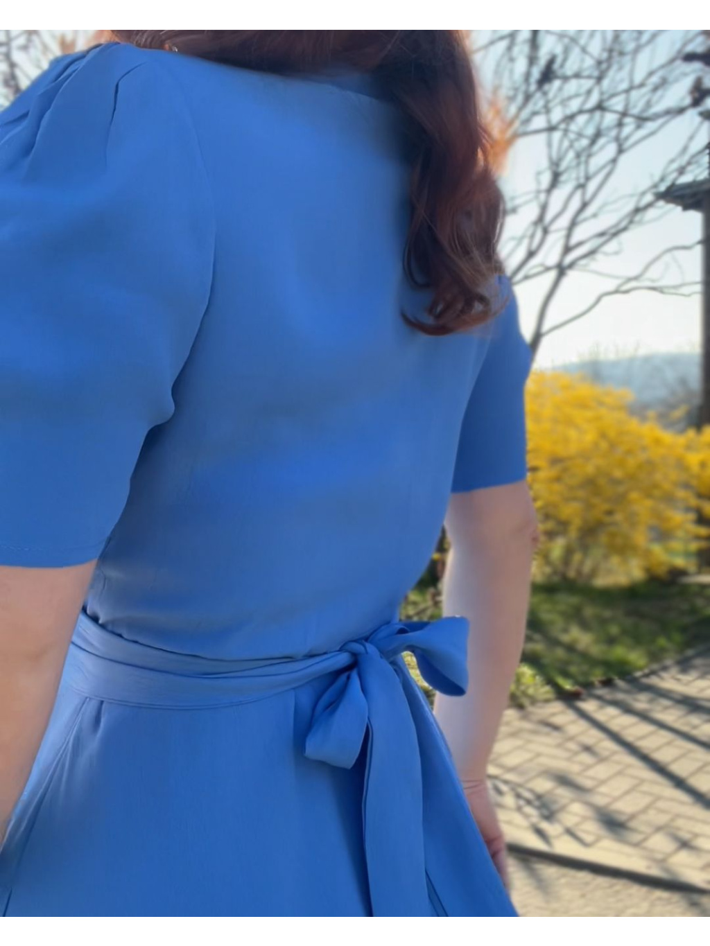 Šaty vytvářejí klasickou siluetu 40. let, mají tedy výraznější ramena. Véčkový výstřih je doplněn jemným řasením u ramenou i okolo dekoltu. Dominantou těchto šatů je kosočtverec, na který navazují dvě stuhy na zavázání za zády, čímž vytvoříte linii pasu přesně dle výšky Vašeho přirozeného pasu. Áčková sukně má v bocích praktické kapsy. Šaty mají skrytý zip v boku.