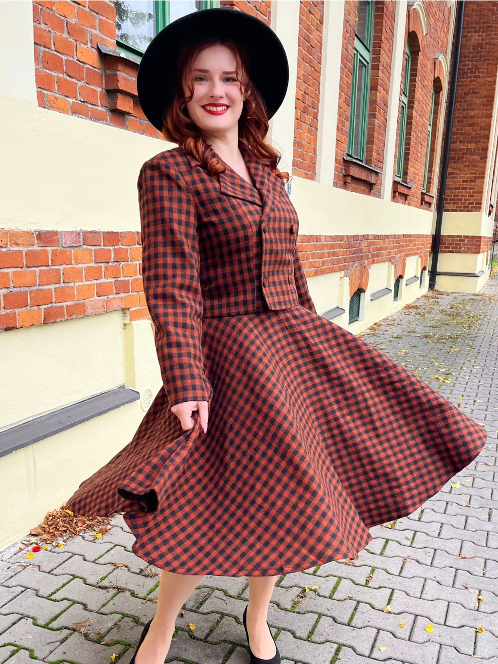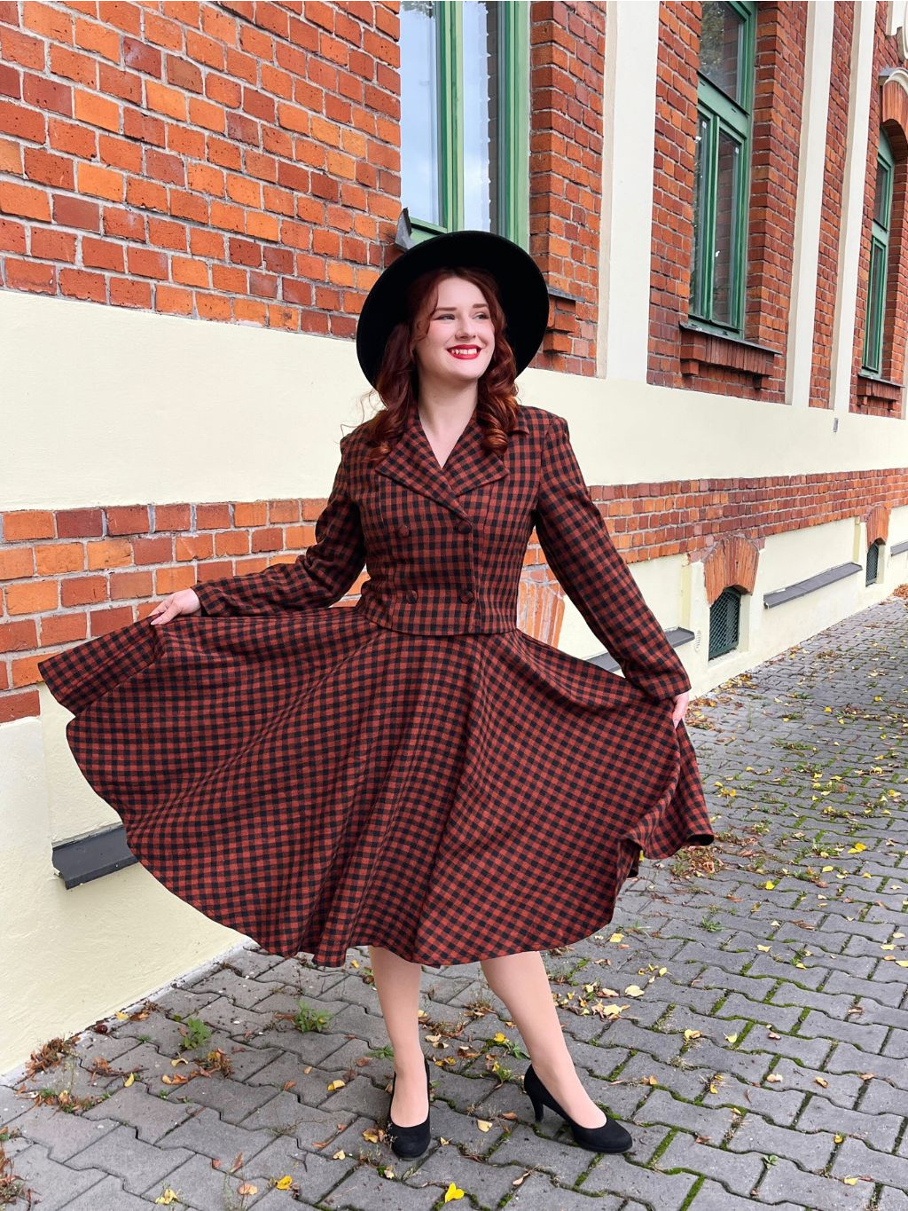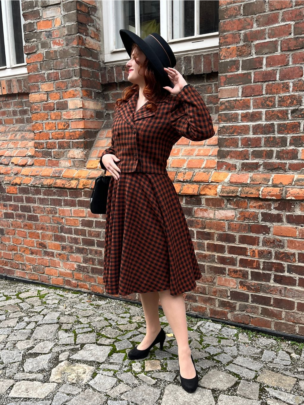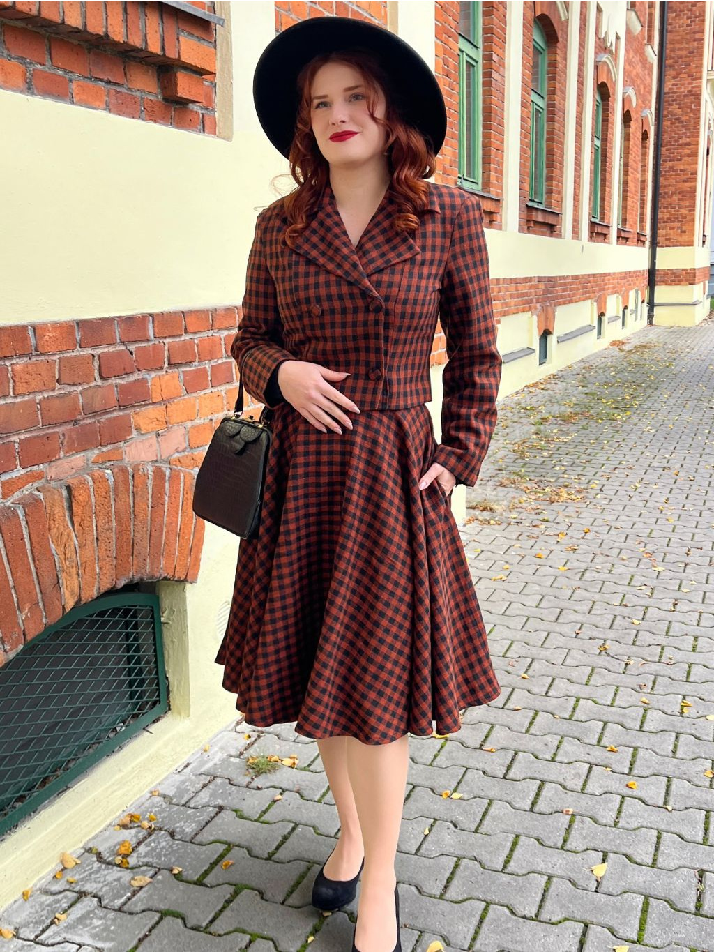 Sako má funkční dvouřadé zapínání na čtyři knoflíky a klasický výstřih s límcem. Celé je podšité černou látkou, což zvyšuje komfort i odolnost. Skvěle se hodí k sukni Sophia ve stejném vzoru, s vlněným kloboukem vytvoříte outfit jako vystřižený z dobového časopisu.