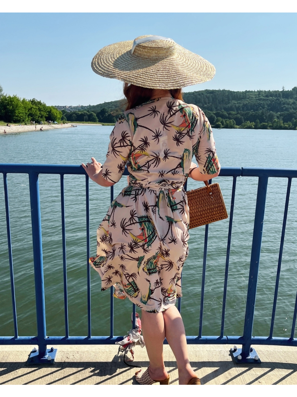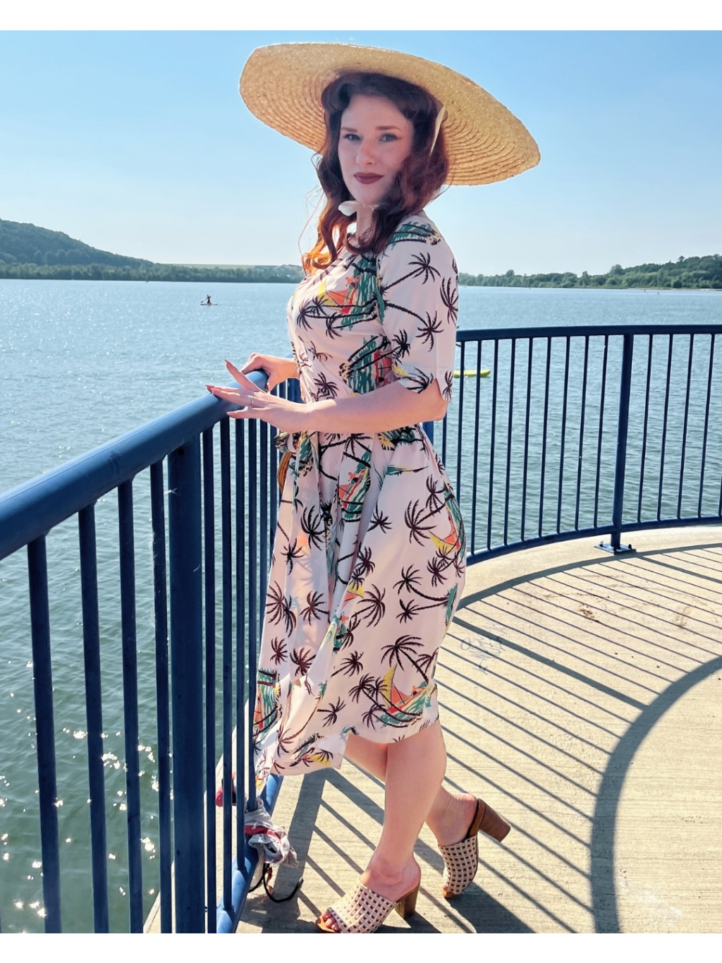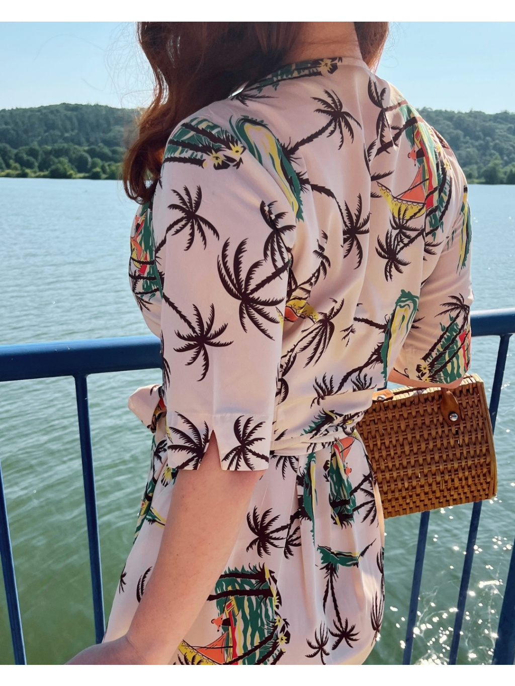 Délka rukávu ke loktům dodává šatům elegantní nádech, ale díky hravému potisku s motivem Tahiti palem a retro scenérií zůstávají pořád svěží a neformální.