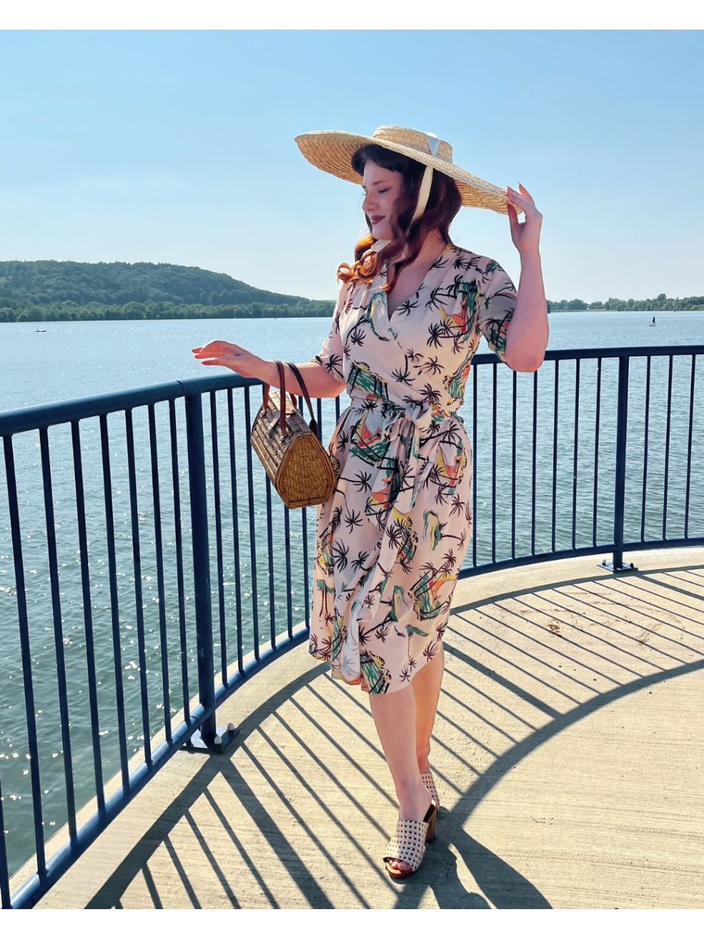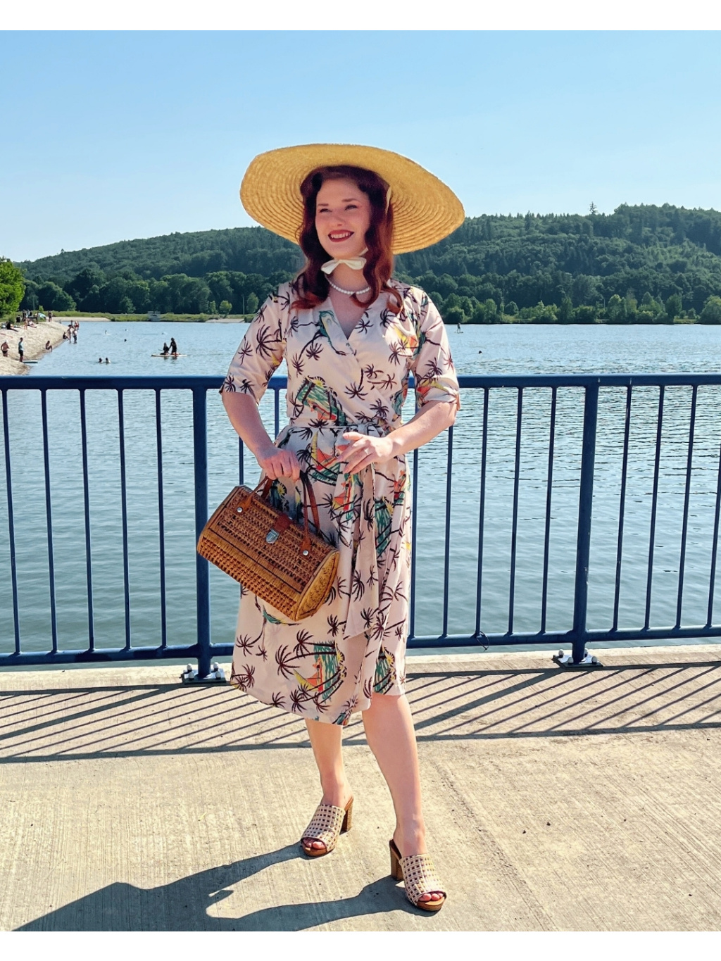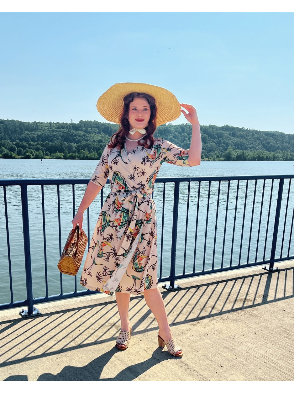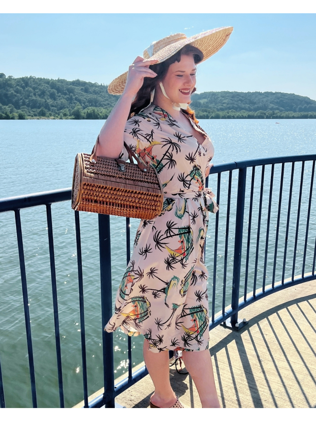 Délka rukávu ke loktům dodává šatům elegantní nádech, ale díky hravému potisku s motivem Tahiti palem a retro scenérií zůstávají pořád svěží a neformální.